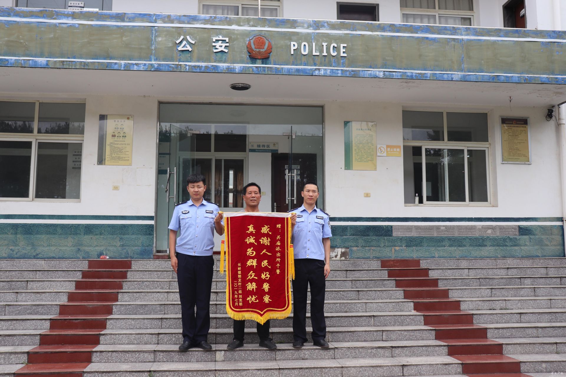 “真是感谢警察同志啊,没想到钱包这么快就找回来了。”7月24号上午,失主刘某高兴地将锦旗送到关庙派出所,对黄警官、杨警官表示衷心的感谢。