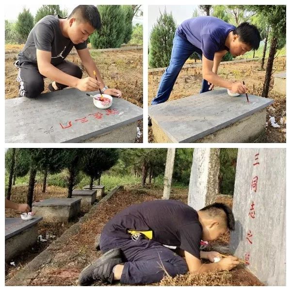 大家手握朱红油漆笔,一笔一画认真地在革命先烈碑文上描摹着。经过两个多小时的努力,最终完成了整个陵园全部烈士墓的碑文描红,使得烈士墓碑焕然一新。