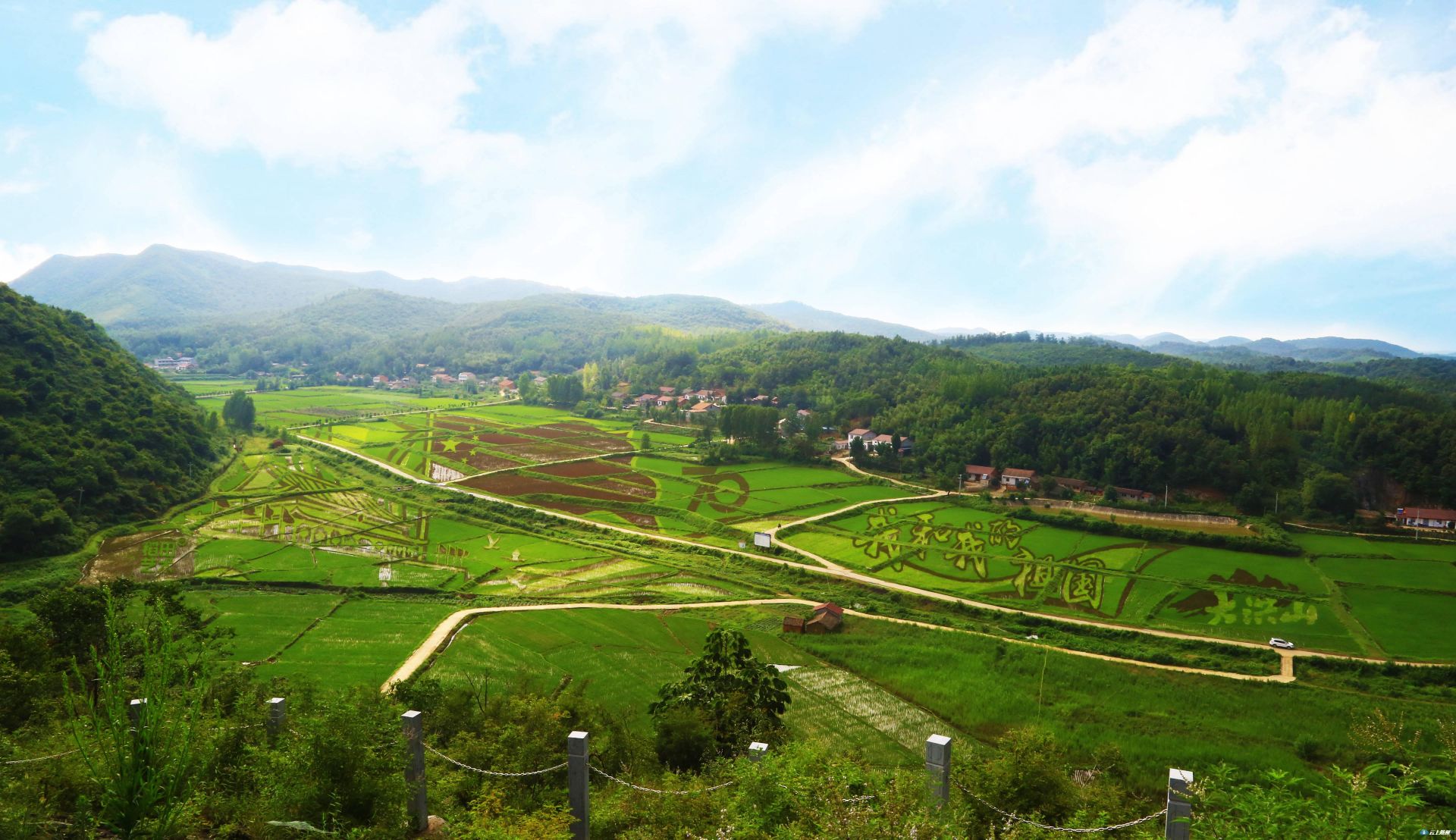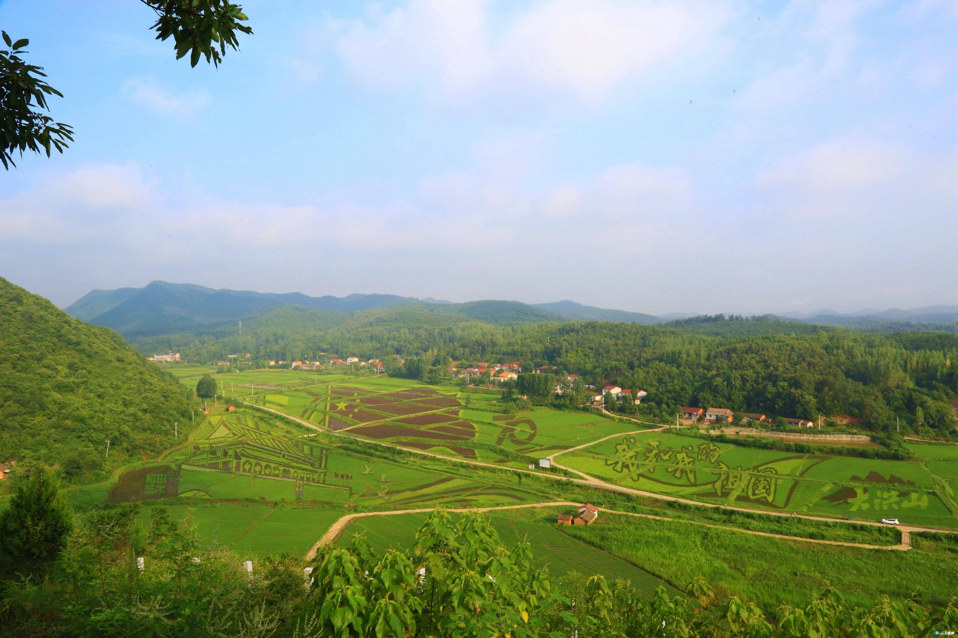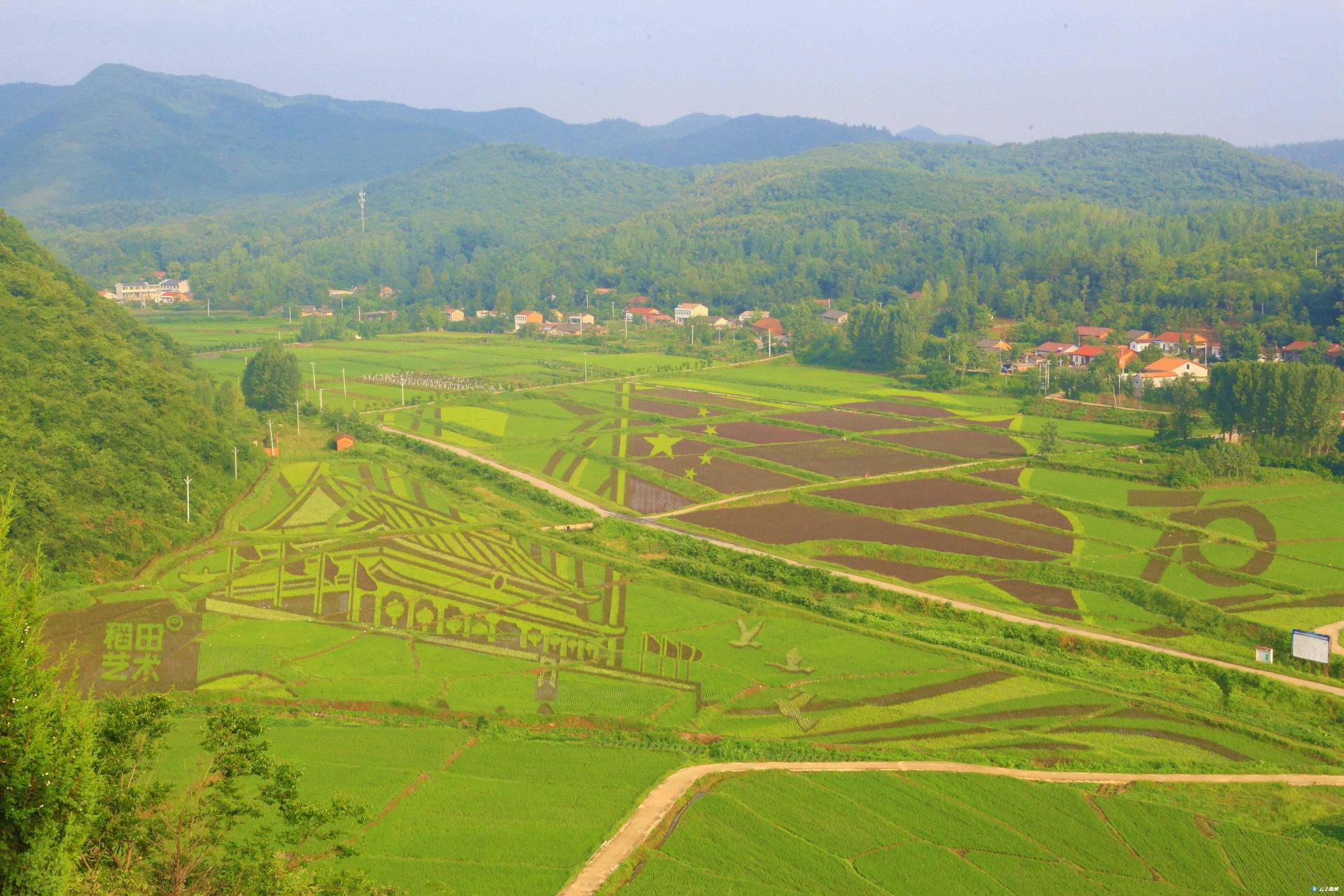 为庆祝新中国成立70周年,景区的稻田艺术以“我和我的祖国”为主题,采用黑、红、黄、白、青五种颜色的秧苗,艺术化勾勒出天安门、国旗、“70”、“我和我的祖国”、“大洪山标识”等图案或字样,庆祖国70周年华诞。