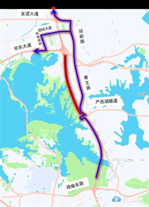 欢乐大道往东湖高新的车辆,建议绕行杨春湖路、团结大道、站前路、青王路,经鲁磨立交上三环线。