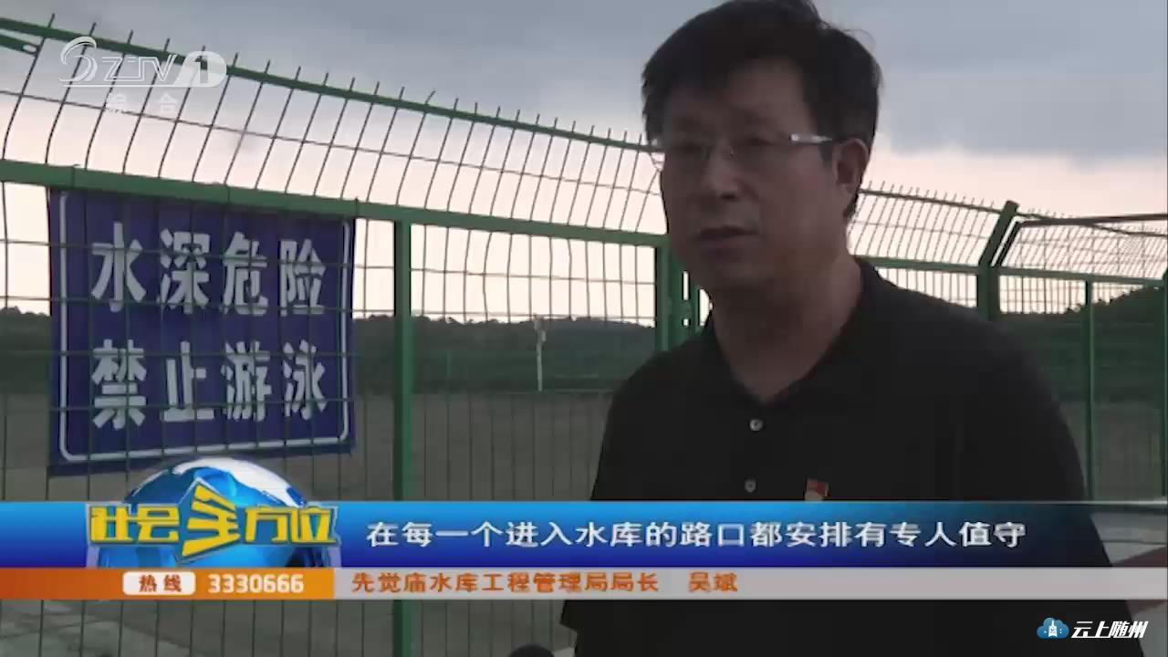 【采访】先觉庙水库工程管理局局长 吴斌:在随州的新闻媒体刊发了关于禁止在先觉庙水库游泳、垂钓的通告;同时,我们在先觉庙水库的重要路口和醒目位置安装了像这样的“水深危险,禁止游泳”的标识标牌30多个;我们在先觉庙水库的一级保护区设置了围网、围栏5000多米;我们每一天的下午两点到七点半,在每一个进入水库的路口都安排有专人值守。