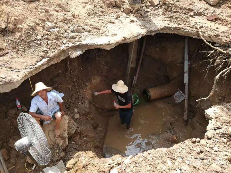 抢修人员紧急制定抢修方案后,小心翼翼撬开水泥层,下面是厚厚的泥地,挖掘起来非常费力。上午9点多,太阳高悬,抢修人员的衣服已湿透了。