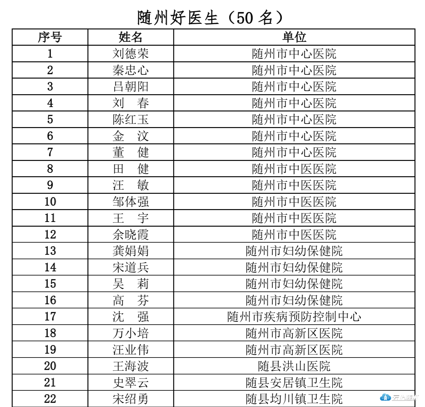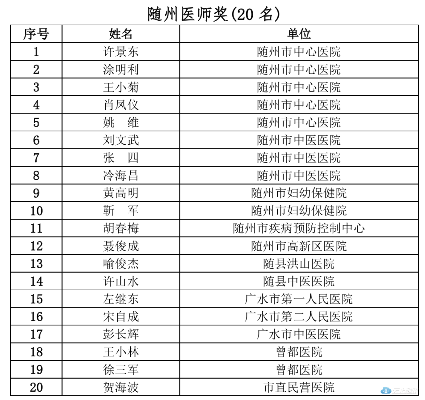 2019年6月-7月我市开展了“随州医师奖”和“随州好医生”系列评选活动。经层层评选,逐级推荐,现将拟表彰的“随州医师奖”和“随州好医生”名单公示如下: