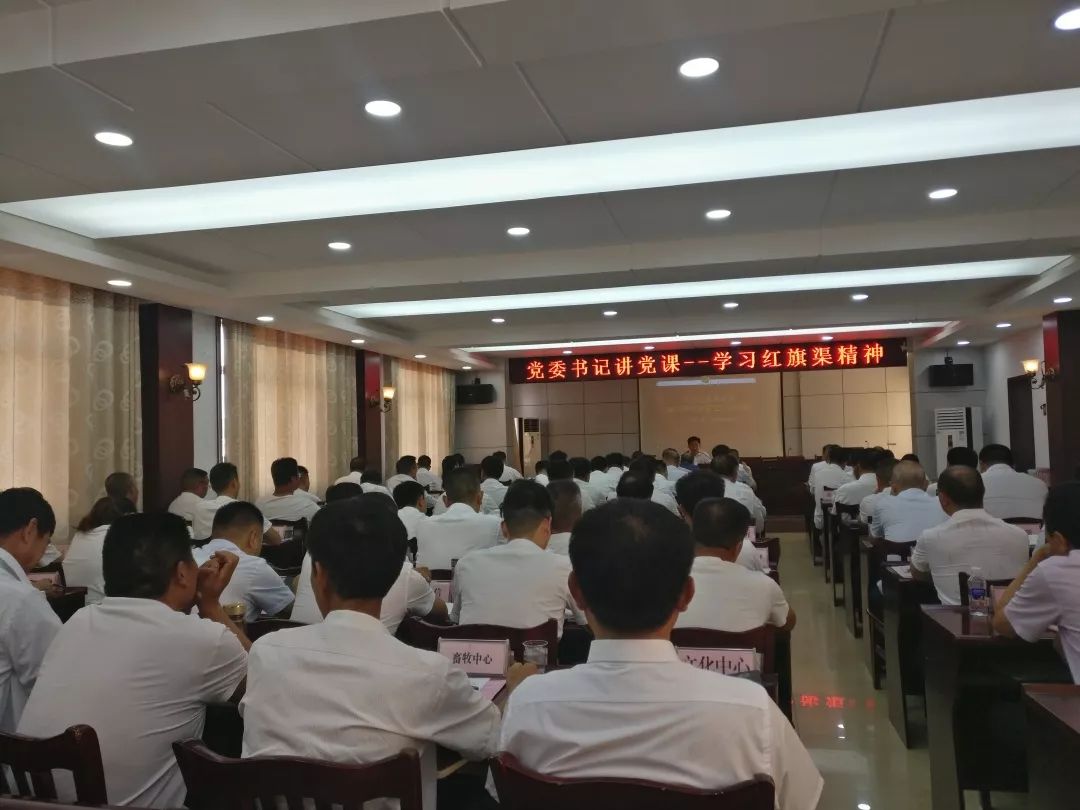 镇党委书记李晖根据在红旗渠培训学习期间的所学、所思、所见、所感,结合万店当前的工作实际,为与会人员上了一堂题为《学习红旗渠精神,奋力开创万店工作新局面》的党课,通过一个个生动形象、感人至深的典型事例,向参会人员传递自力更生谋发展、艰苦创业辟蹊径、团结协作聚力量、无私奉献敢为先的红旗渠精神。