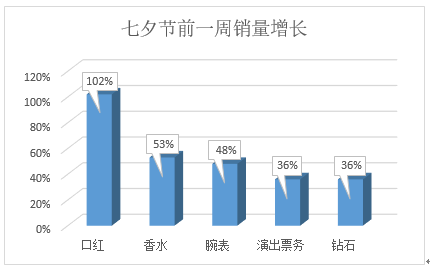 最受直男偏爱的口红、香水蝉联“最不会送错”的情节人礼物,销量比平时分别增长了102%、53%。此外,腕表、演出票务、钻石销量比平时分别增长了48%、36%、36%。