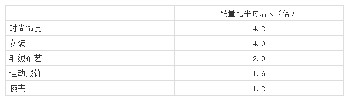 异地订单中,时尚饰品、女装、毛绒布艺、运动服饰、腕表销量比平时增长较高,年轻、时尚属性突出。