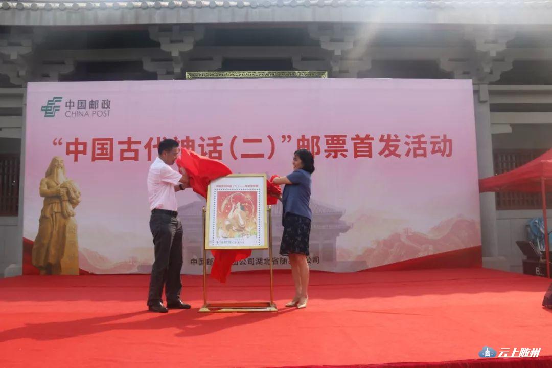 首发仪式上,炎帝故里风景名胜区党工委书记冯晓蓉、中国邮政集团随州市分公司总经理阳海龙共同为《中国古代神话》特种邮票揭幕。