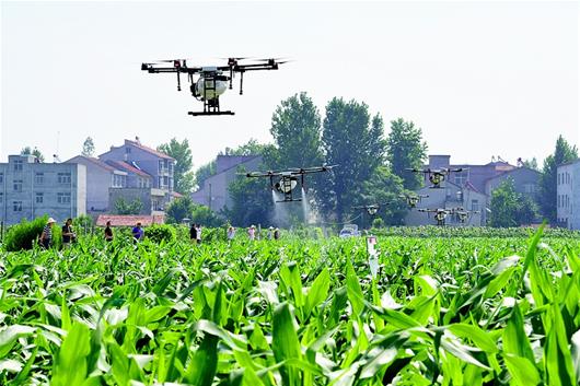 图为:在襄阳市樊城区牛首镇黄丰村,植保无人机在玉米大田里喷药,防治草地贪夜蛾。
