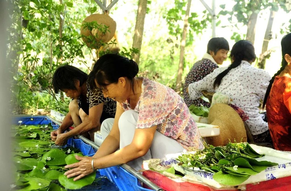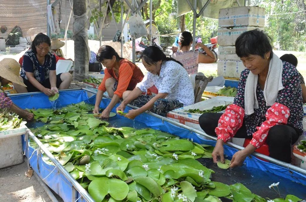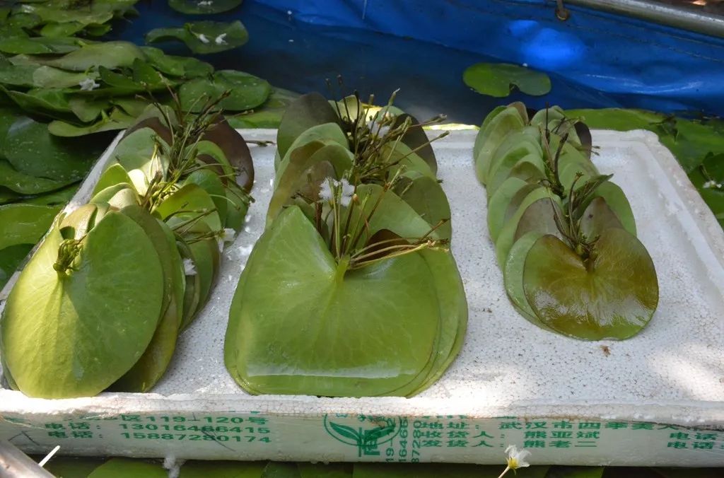 村头阴棚下,20余位村民们正熟练地清洗莲叶,整齐地排放在塑料盘内。“今天晚上,这些莲叶都要运往武汉天河机场。”老肖说,发货要快,保证鲜活,他们每天5点半开始采摘,8点后清洗、装袋、装箱打包,下午由快递公司人员上门拉货,运至天河机场,搭乘航班发往大城市,部分产品还能卖到日本、韩国、泰国。每天如此循环,至今已有两个多月,一片叶0.9元,日收入过万元。