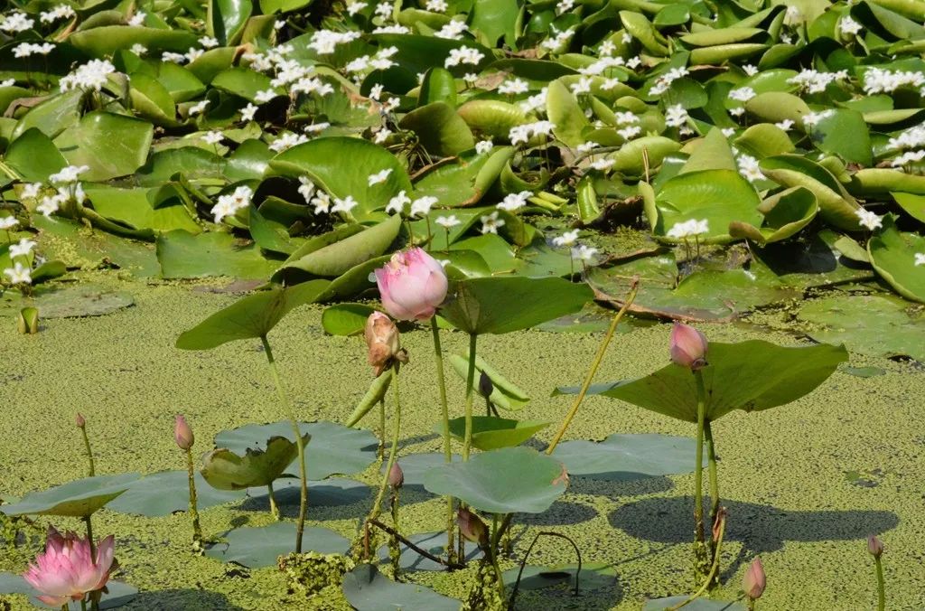 心形莲叶铺满水面,叶片上方撑开朵朵白色小花。8月8日,记者在随县厉山镇同心村欣赏到这道清雅风景。