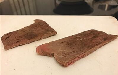 一块牛肉样品被暖宝宝贴住1.5小时后,切开显示大半成深红色。