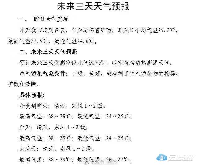 今天晚上到明天白天:晴天到多云,25℃~38℃;