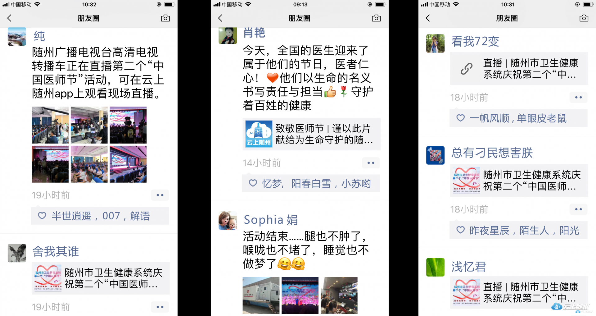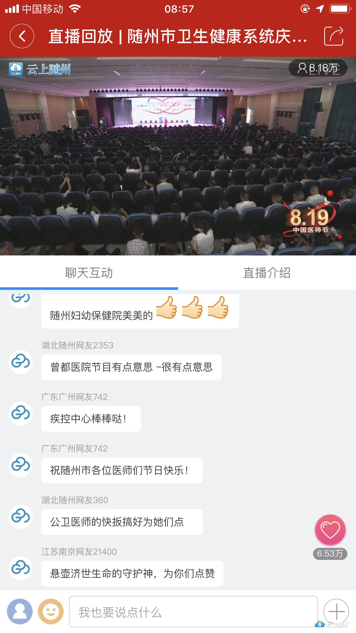 这次直播不仅全面展示了我市4000多名医务工作者“敬佑生命、救死扶伤、甘于奉献、大爱无疆”的崇高精神,更在全社会营造和传递了尊医重卫的和谐氛围。立足随州、传遍神州,由移动视频带来的观看和互动效果而产生的巨大影响力已不言而喻。一些来自全国各地的网友在聊天互动区纷纷留言表达了对医务工作者的美好祝福。同时,昨天的直播也刷爆了广大随州网友的朋友圈,他们为节目点赞,向随州医师表达节日的问候。