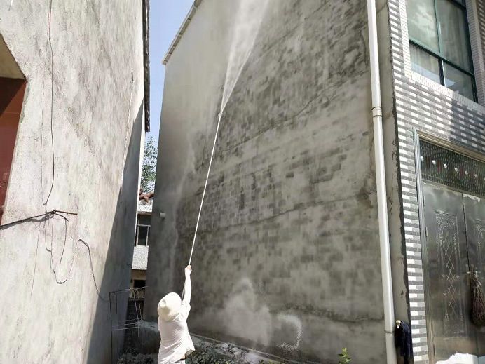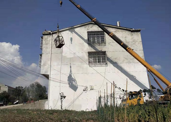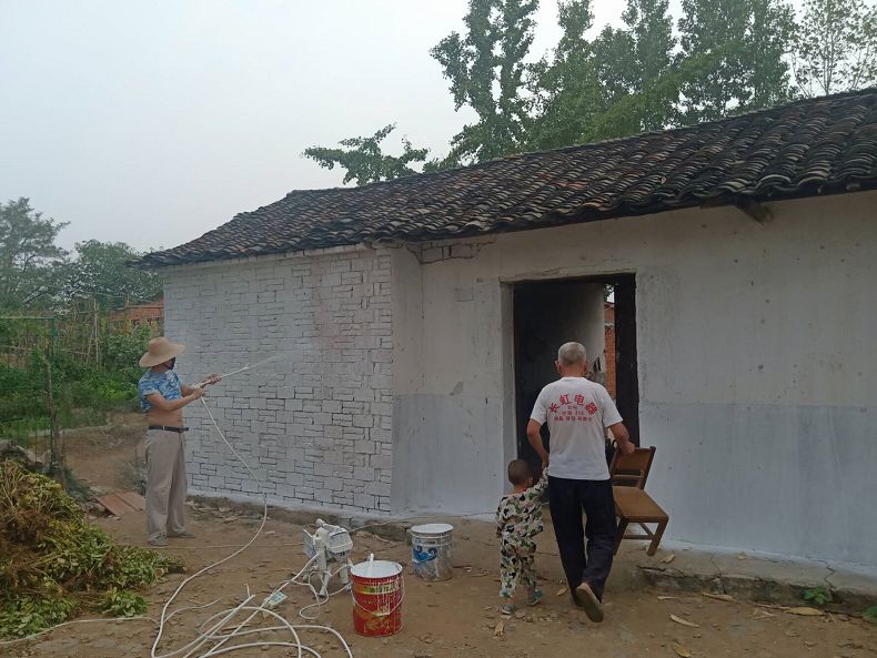 均川镇高铁沿线均河口村环境整治,工作人员正在施工粉刷墙壁和换瓦。