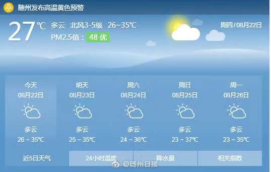 根据目前气象资料分析,预计未来十天我市仍以晴热少雨天气为主,大部地区日最高气温37℃-39℃,其中8月27日我市有一次小到中雨天气过程,高温略有缓和。预计8月21日至31日全市累计雨量为10毫米-20毫米,局部30毫米-60毫米,对干旱缓和作用不明显,后期干旱可能会持续发展、加重。