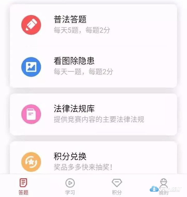 身份信息确认后进入答题页面,可进行普法答题(10分)、看图除隐患(2分)、法律法规库(3分)等内容,每人每天最多可答15分。