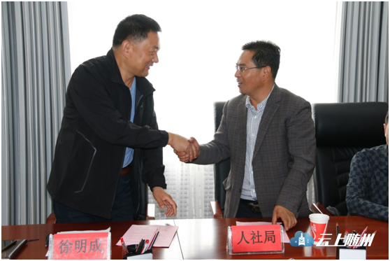积石山县副县长宋永强与随州市人力资源和社会保障局副局长徐明成交谈