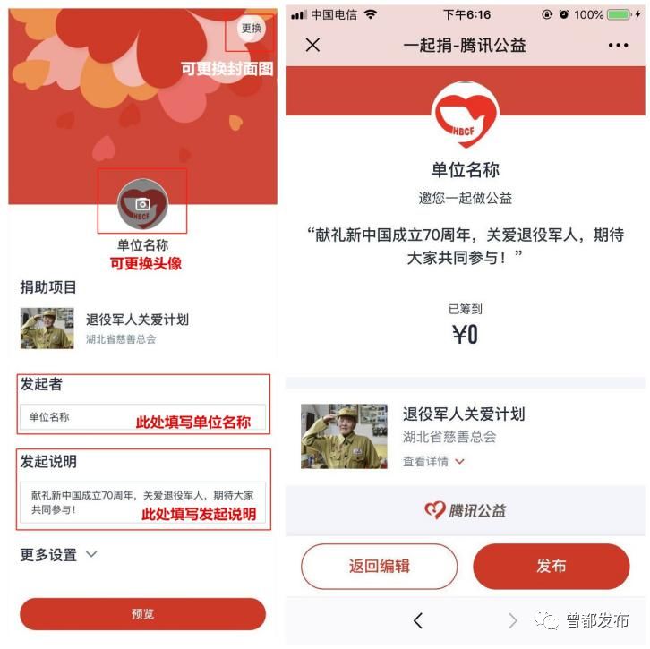 2. 在“一起捐”页面,按图示填写信息。在“发起说明”栏填写“献礼新中国成立70周年,关爱退役军人,期待大家共同参与!”点击“预览”后即可“发布”。在“更多设置”中建议不限定每笔捐款金额,也不设筹款目标。