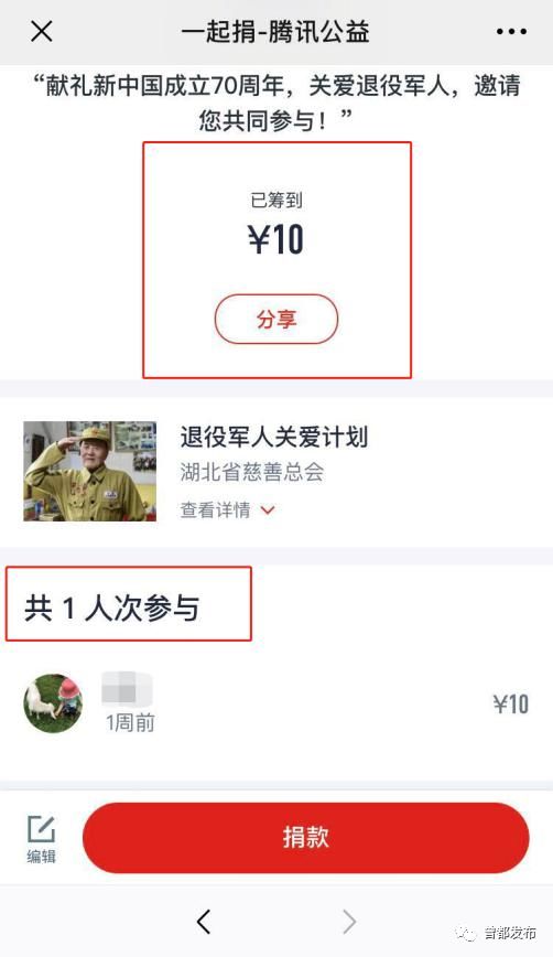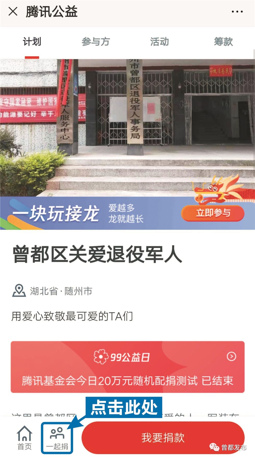 湖北省慈善总会已为各县、市、区退役军人服务中心,在“腾讯公益”平台创建各自冠名的“退役军人关爱计划” 关联项目。各单位可安排工作人员在对应关联项目下,以单位名义创建“一起捐”链接,参与“慈善一起捐”。
