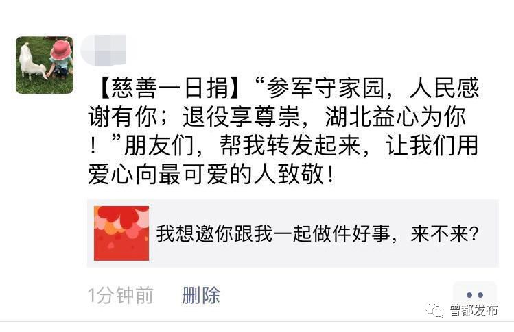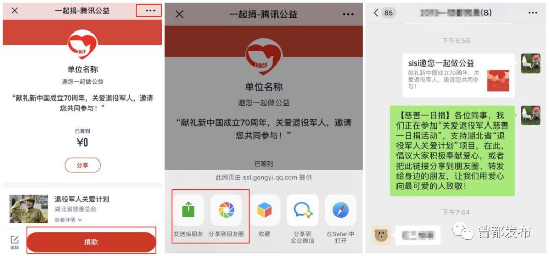 4. 注重传播慈善理念,单位职工在转发、分享“一起捐” 链接时,需分享一段传播话语,如:【慈善一起捐】“参军守家园,人民感谢有你;退役享尊崇,湖北益心为你!”朋友们,帮我转发起来,让我们用爱心向最可爱的人致敬!