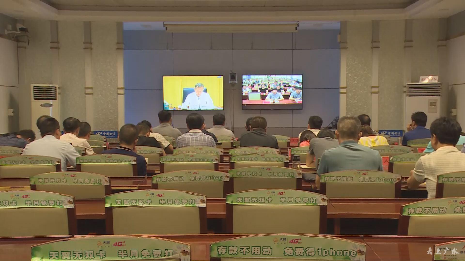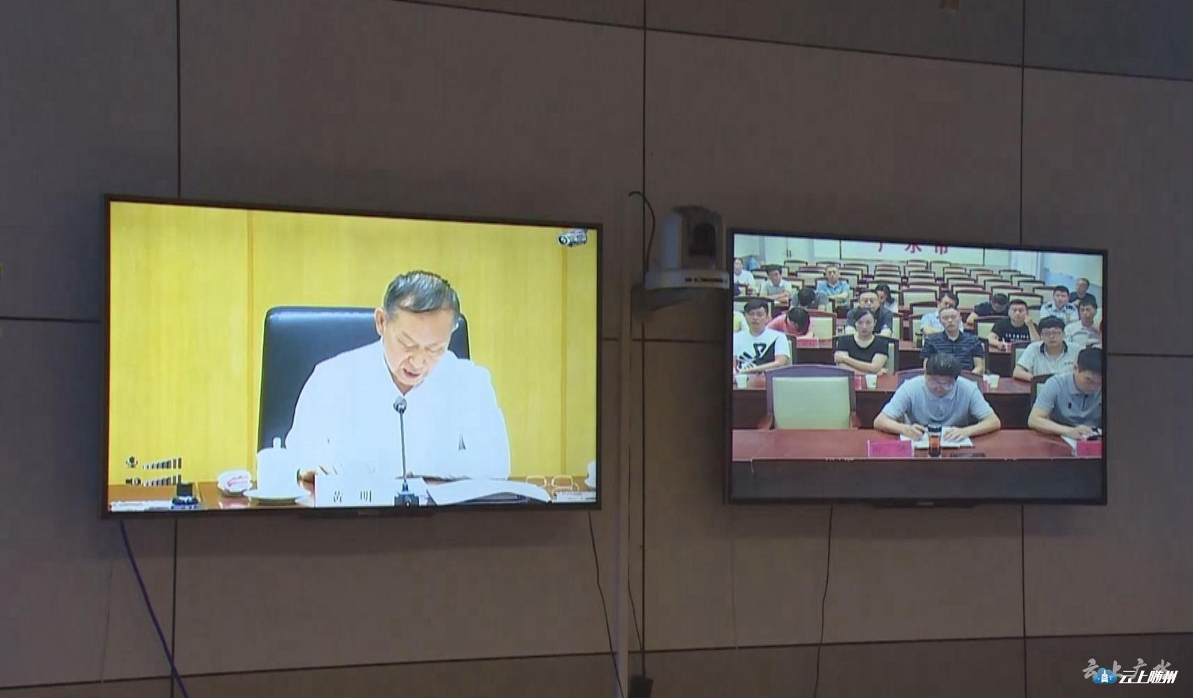 广水市市长田涛、市委常委、常务副市长何胜、副市长左扬在广水分会场收听收看电视电话会。