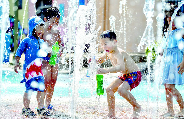 图为:昨日天气炎热,孩子们在武汉市东西湖区一处室外喷泉广场戏水