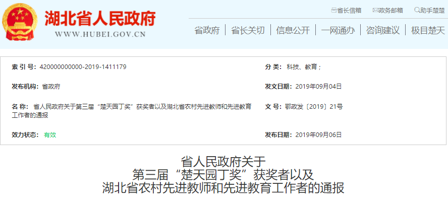 教育是民族振兴、社会进步的基石,对提高人民综合素质、促进人的全面发展、增强中华民族创新创造活力、实现中华民族伟大复兴具有决定性意义。教师是人类灵魂的工程师,是人类文明的传承者。近年来,全省广大教师和教育工作者深入学习贯彻习近平新时代中国特色社会主义思想,全面贯彻党的教育方针,落实全省教育大会精神,教书育人,默默奉献,涌现出了一大批先进个人。为弘扬尊师重教的良好风尚,建设高素质教师队伍和教育管理干部队伍,省人民政府决定,授予刘晓红等80名同志第三届“楚天园丁奖”荣誉称号、张春莉等40名同志“湖北省农村先进教师”荣誉称号、何晓芳等10名同志“湖北省先进教育工作者”荣誉称号(名单附后),现予以通报。