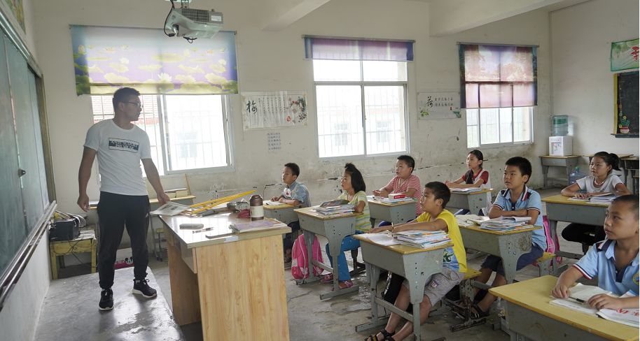 “希望把山里的孩子慢慢地往外面带,让他们有更好的平台发展。在这里坚守一生,我无怨无悔。”曹权是朱店人,他把对朱店父老乡亲们的热爱,转化为对学生们的爱。隔壁的五年级教室内,支教的年轻老师孟亮,也在专心致志给孩子们上课。