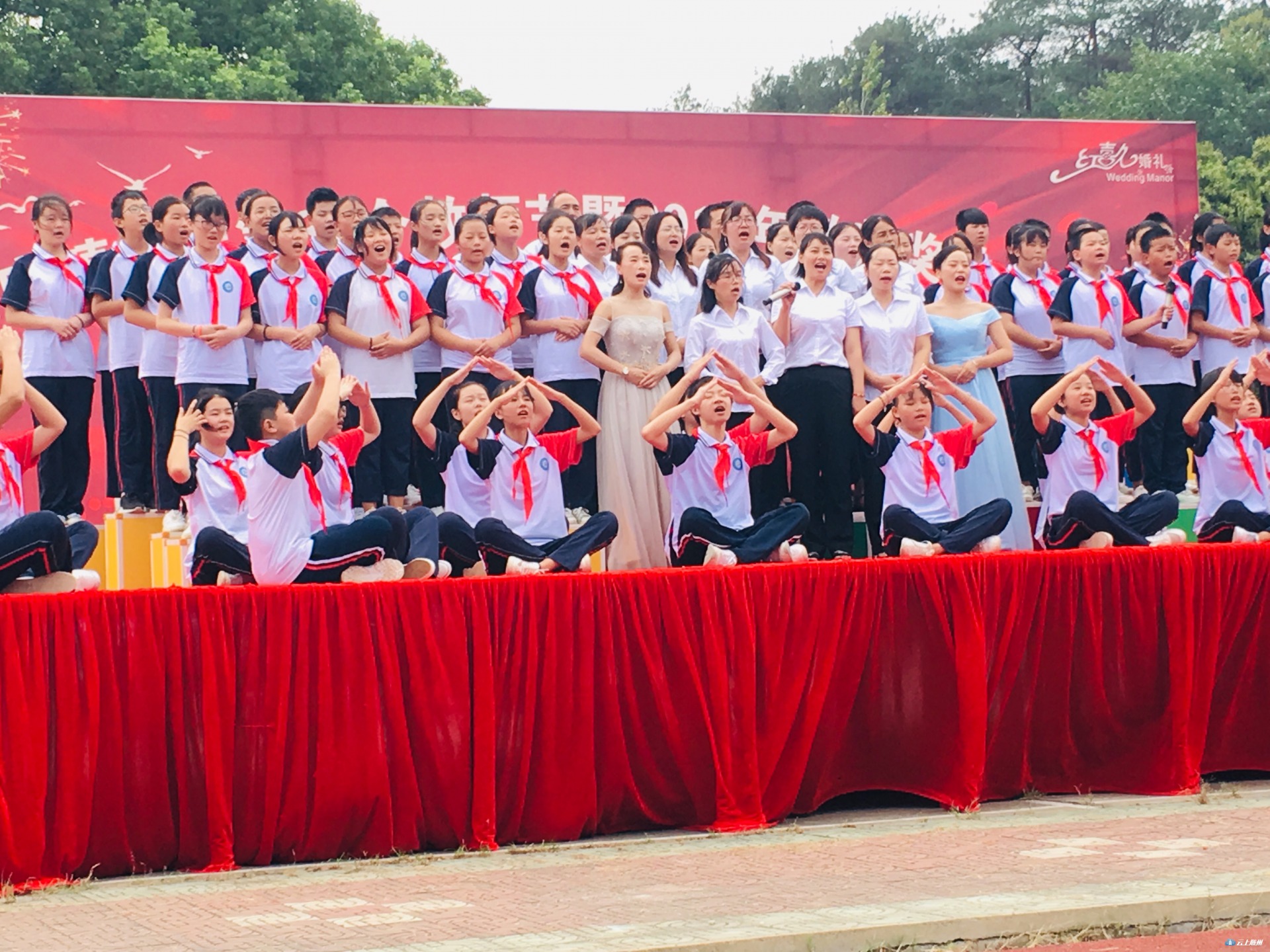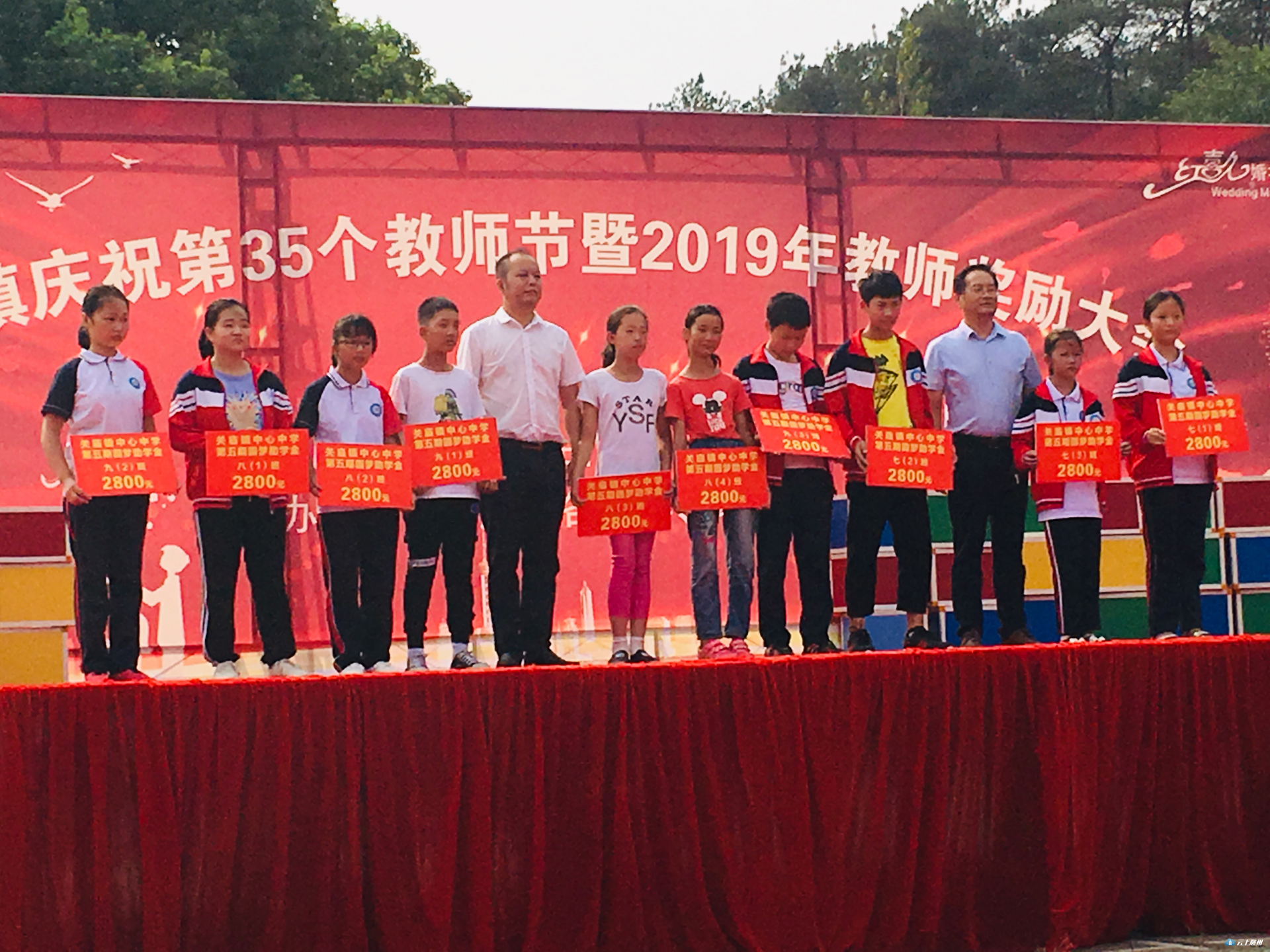 活动现场,中心小学的一支爵士舞《踏青采茶》拉开了表彰的序幕。文艺节目与颁奖活动交互进行,气氛热烈,赢得了观众的阵阵掌声。广水市教育局局长黄凌、教育局财务规划科科长熊享波、关庙镇人大主席雷春平、关庙镇中心中学校长张顺亮分别上台为受奖教师和学生颁奖。奖励资金由原关庙镇中学86级校友王宏先生、88级校友卢书平先生捐赠,此次奖励、资助金共计12万元。《中国范》《情系教育》《中华颂》《国家》等10个节目,或热情奔放或舒展大方,每一个节目都充满了同学们对老师的敬意与祝福,这是送给关庙教师最佳的教师节礼物。