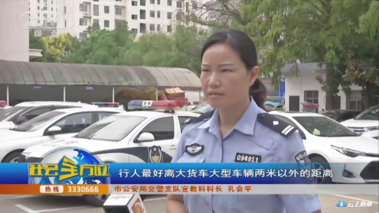 【采访】市公安局交警支队宣教科科长 孔会平:作为我们行人上路包括骑电动车在路上,应该尽量远离体型较大的车辆,包括公交车,大货车,这种体积较大的车辆,我们在驾驶小车的时候也应该尽量避开大型的车辆,以免因为大货车的视角盲区没看到我们,而引发一些不该发生的交通事故。行人最好离大货车大型车辆两米的距离,相对安全。作为大货车的驾驶员,在交叉路口,或者是拐弯的时候,要注意多观察,尽量是提前鸣笛,打灯光提醒路边的车辆和行人,尽量远离自己。