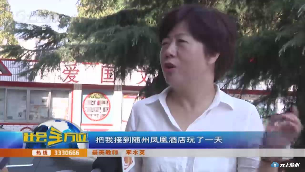 【采访:最美教师 李水英】去年的时候,有一大群在外面很优秀的学生,专门开车到我家里来,把我接到随州凤凰酒店玩了一天,他们打电话叫我去玩的时候我拒绝了,结果他们自己开车到我家里来接,要表达对我的感激之情,这让我感到非常的幸福。