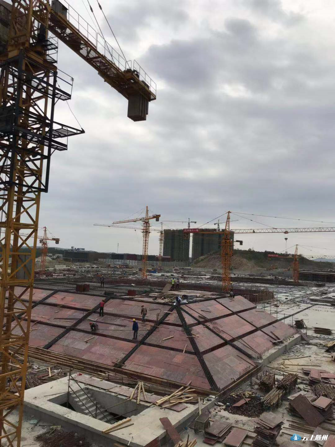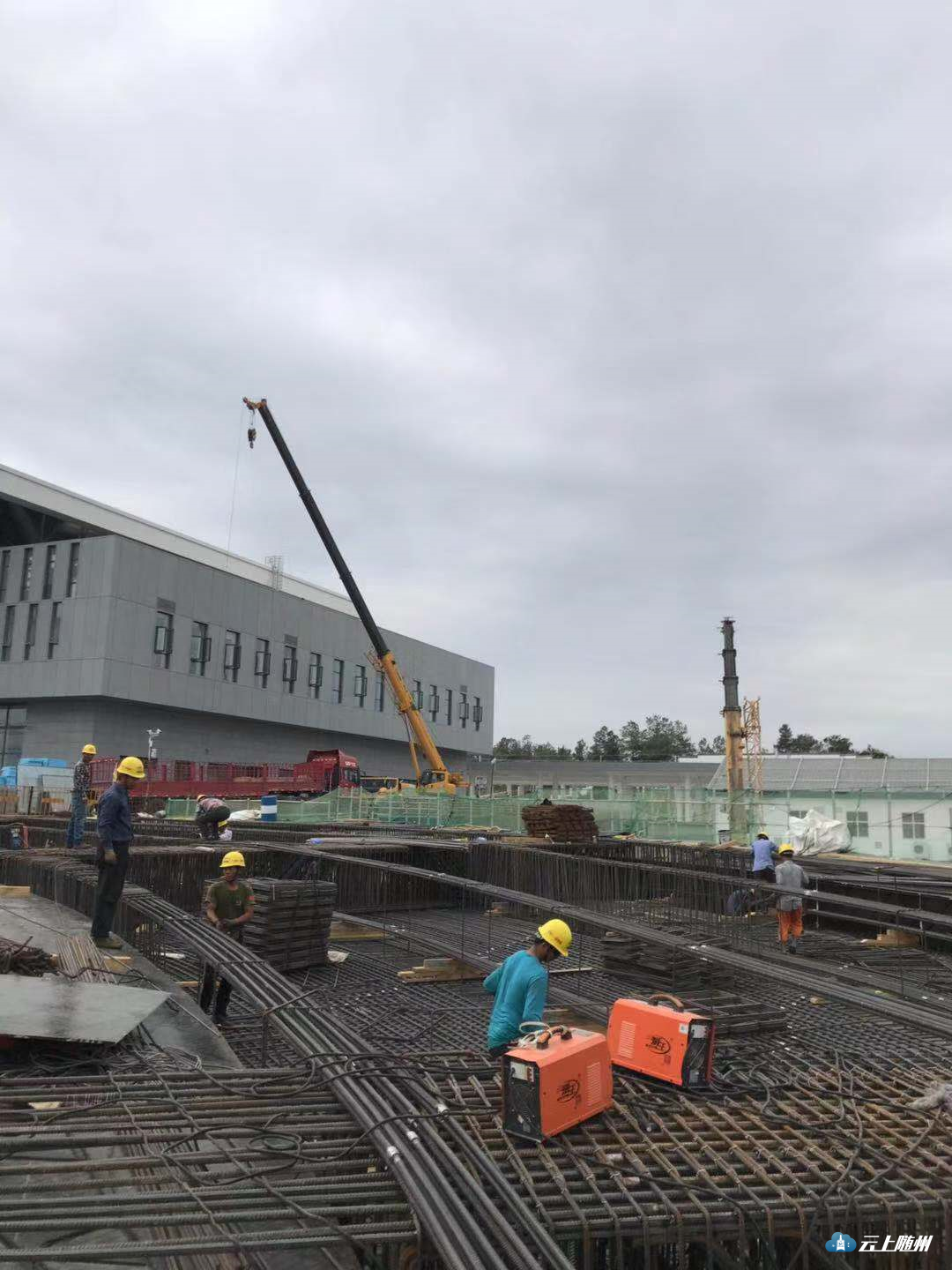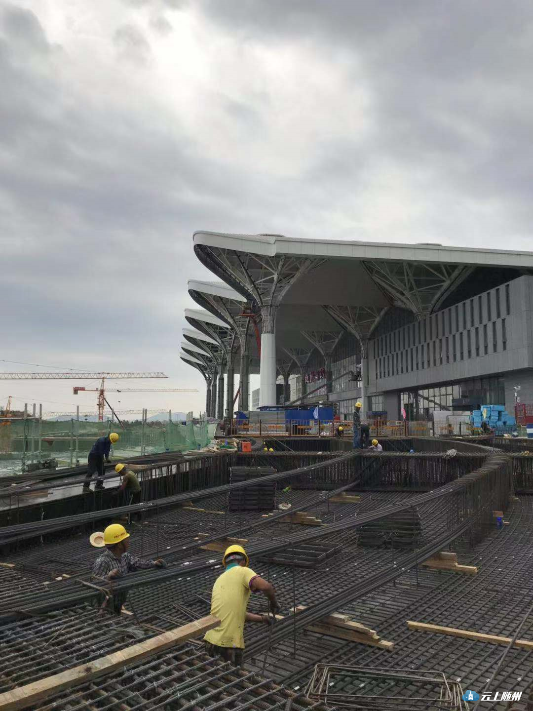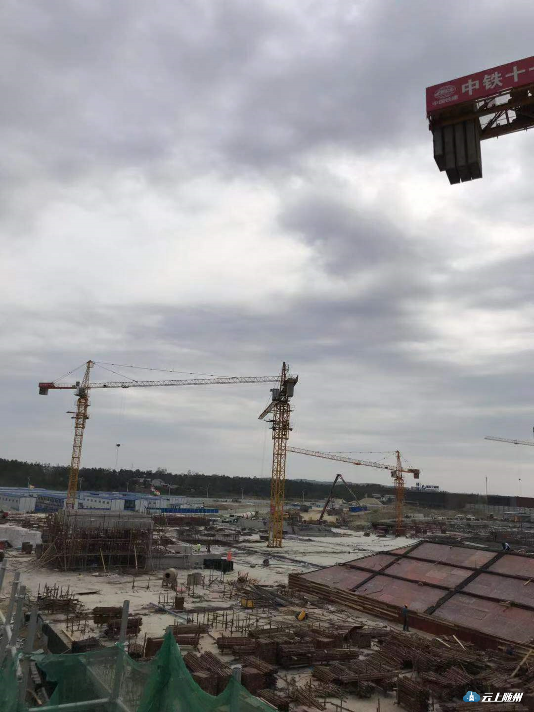 走进汉十高铁随州南站站前广场项目施工现场,10台塔吊挥舞着臂膀,工人师傅正紧锣密鼓得进行匝道桥箱梁钢筋绑扎以及地面商铺模板支设。