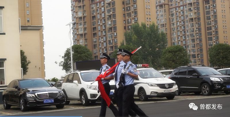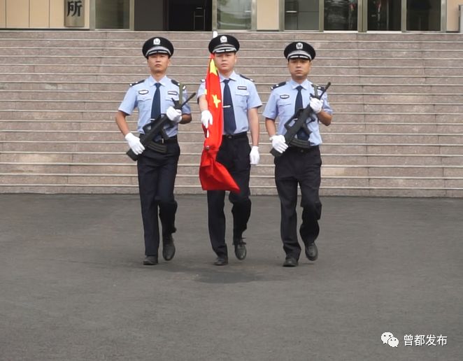 上午9点,升旗仪式开始,伴随着雄壮的国歌声,东城派出所国旗护卫队队员护卫着五星红旗,迈着矫健整齐的步伐走向升旗台。