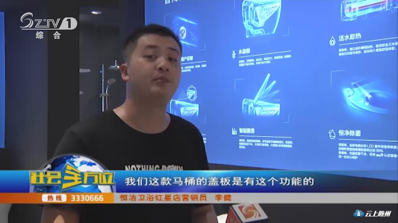 【采访】恒洁卫浴红星店营销员 李健:我们可以利用的有触摸翻盖,轻抬翻盖以及感应翻盖,可以说是非常先进的一款智能马桶。它的整个陶瓷体和盖板材质目前来说做的都是比较好的。它的盖板材质包括有一个荷叶疏水的功能,荷叶疏水像一滴水滴在荷叶上以后,会聚成水珠,然后滑下来,整个荷叶不会被打湿,我们这款马桶的盖板是有这个功能的。