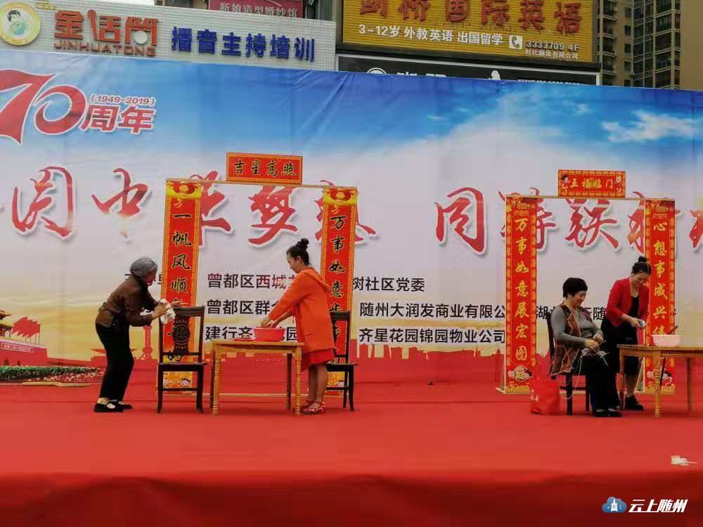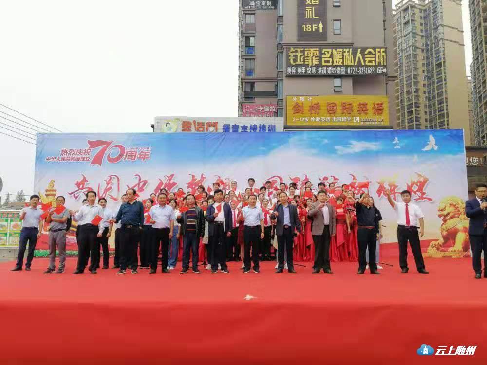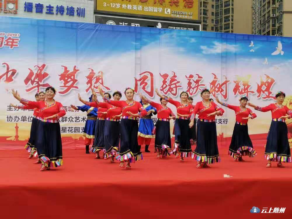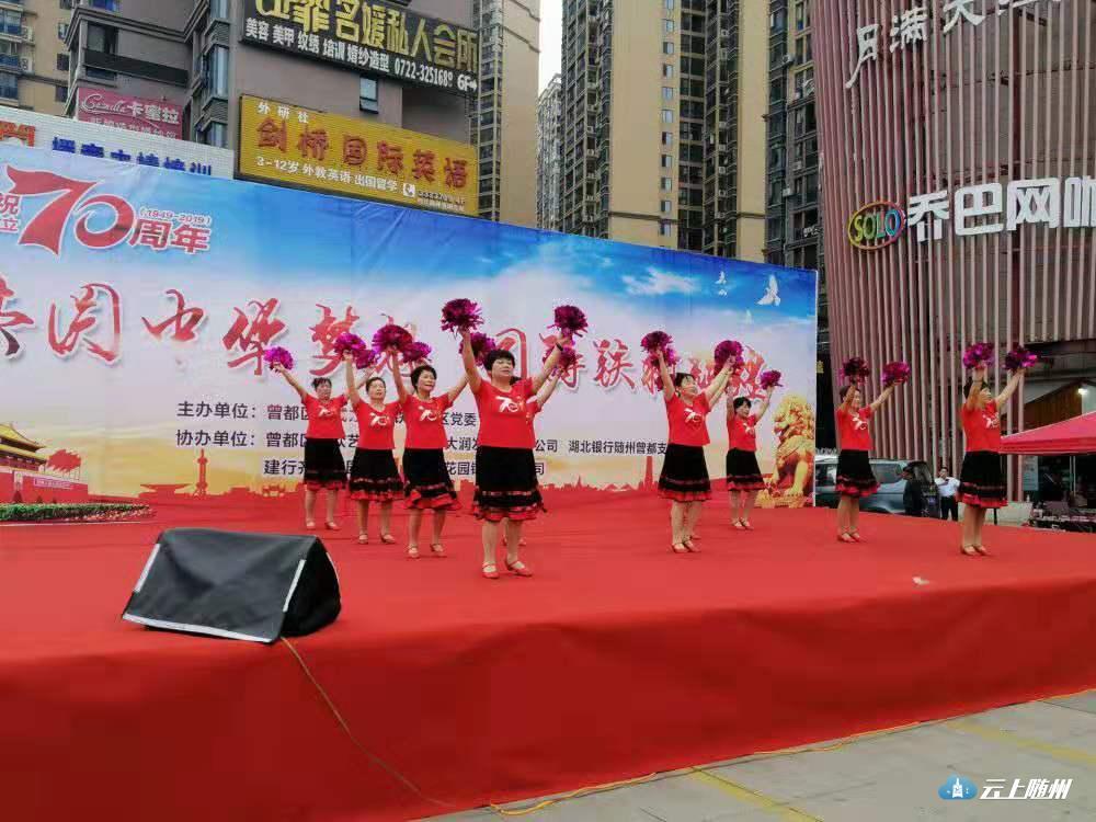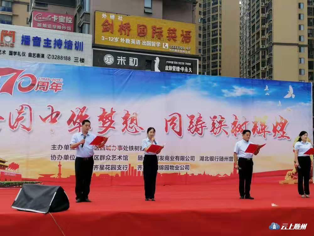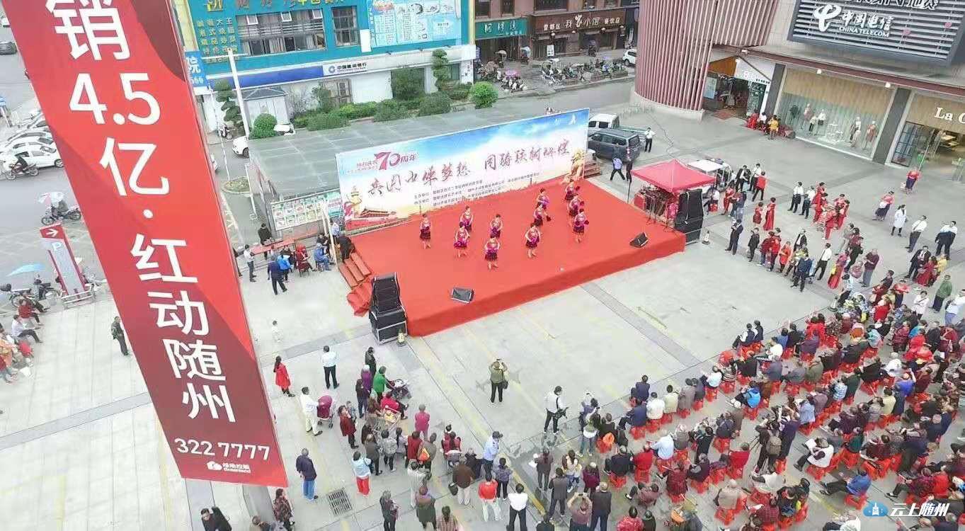 9月18日下午,大润发广场乐曲飞扬、歌声阵阵,由西城铁树社区主办,曾都区群艺馆、大润发商业公司、湖北银行曾都支行等单位共同协办的庆祝建国70周年“共圆中华梦想,同筑铁树辉煌”文艺演出活动在这里精彩上演,500余名群众观看演出。