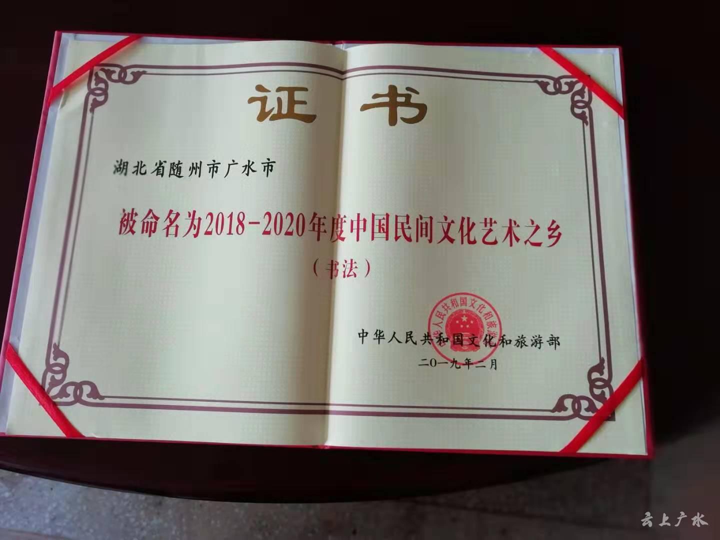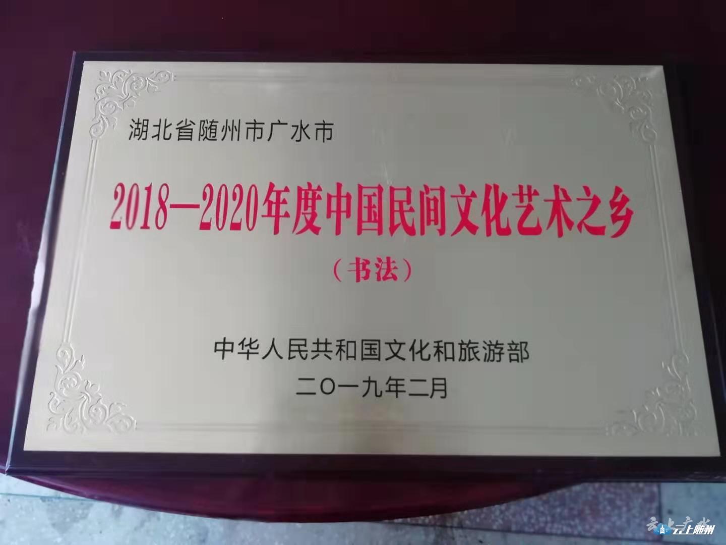 广水市副市长刘东代表广水市政府领取“中国民间文化艺术之乡——书法”牌匾。至此,广水市连续五届蝉联“中国民间文化艺术之乡——书法”荣誉称号;此外,我市还拥有“中国楹联文化城市”、“中华诗词之乡”两张国家级文化名片。