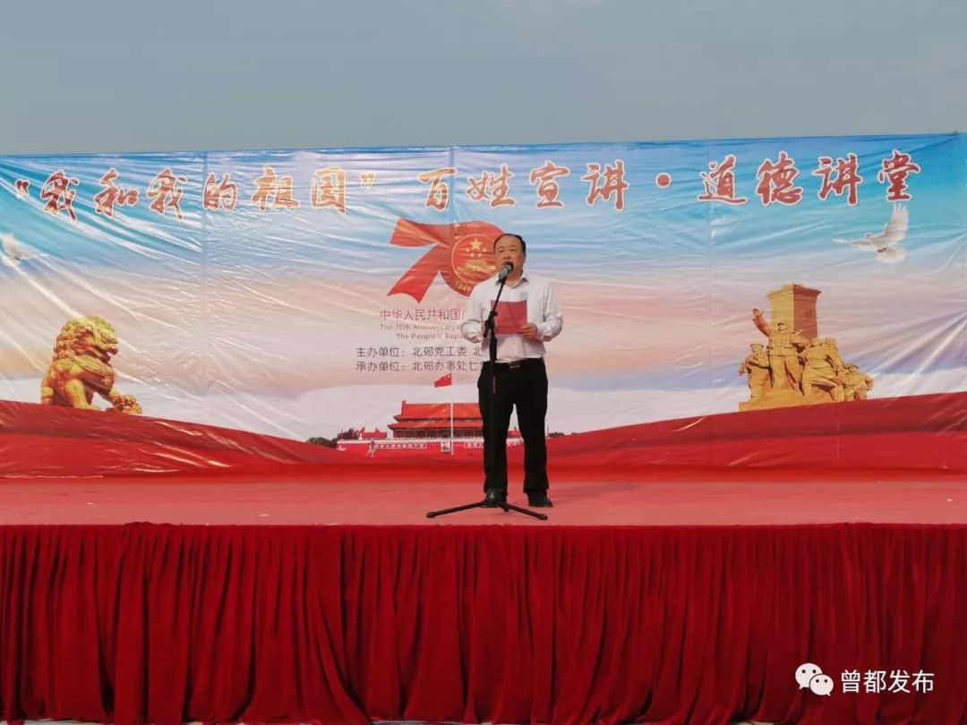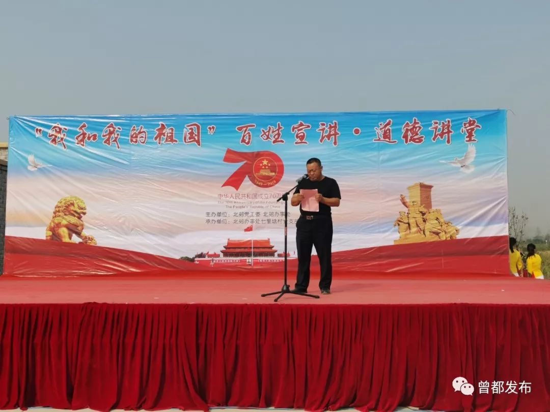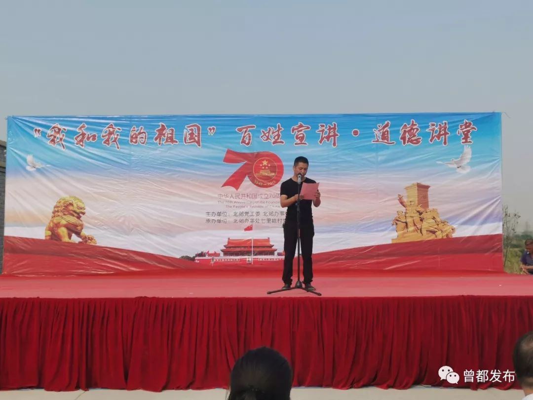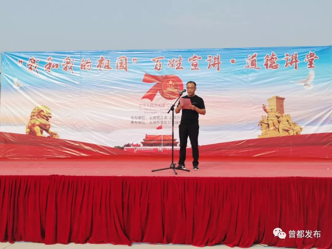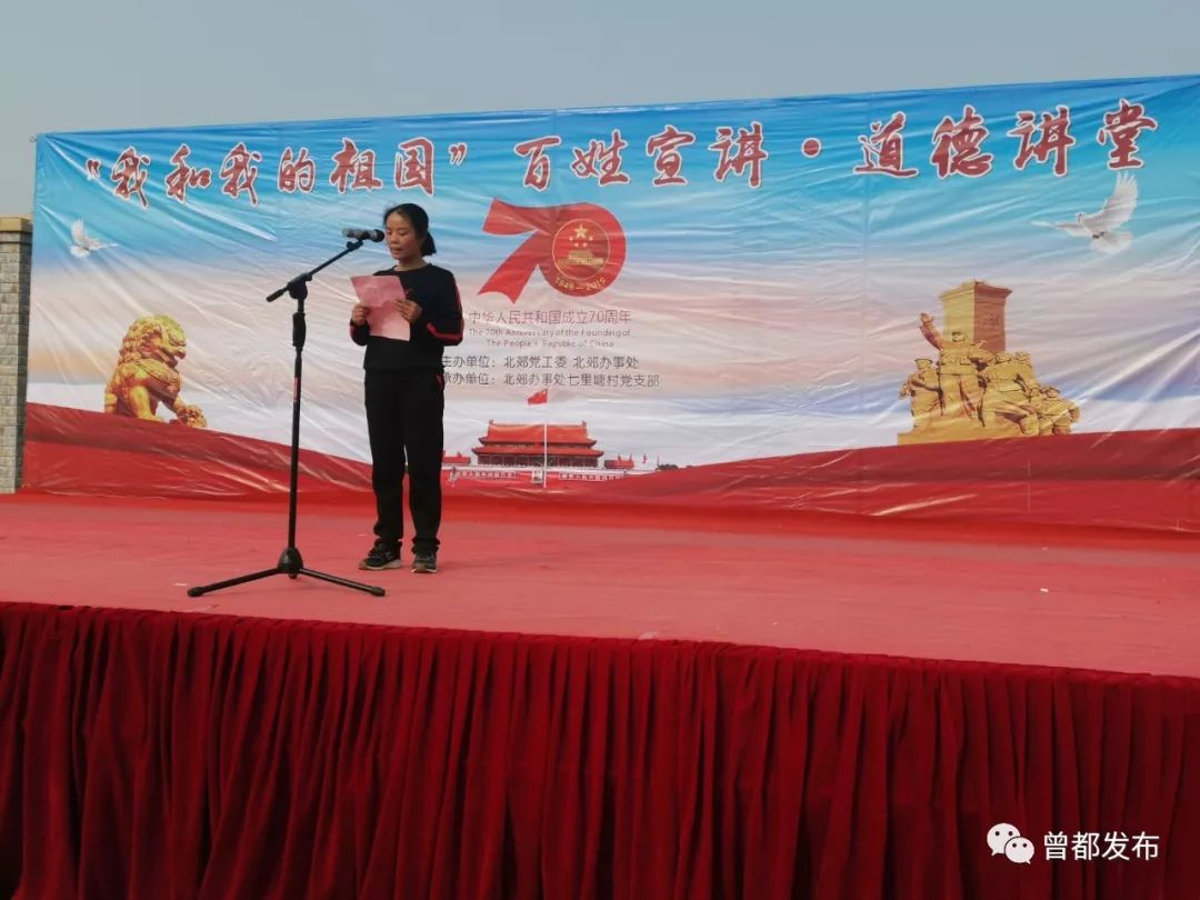 9月26日,北郊办事处七里塘村举办以“我和我的祖国”为主题的百姓宣讲道德讲堂活动,以唱歌曲、诵经典、学模范、做点评、知识抢答五个环节为载体,通过“身边人讲身边事、身边事教身边人”的形式,引领广大群众崇德向善、见贤思齐。
