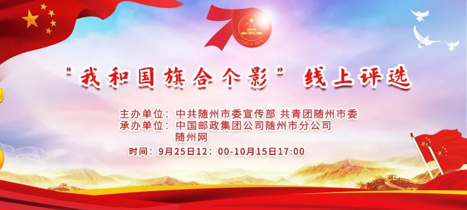 为喜迎新中国成立70周年,激发随州市广大市民爱国热情和“四个自信”,营造“我为祖国送祝福 青春建功新时代”的浓厚氛围,中共随州市委宣传部、共青团随州市委联合中国邮政集团公司随州市分公司、随州网,通过官方微信公众号“青春随州”发起“我和国旗合个影”随手拍有奖征集活动。通过展示同国旗合影拍照的形式,向国旗敬礼,向祖国致敬。