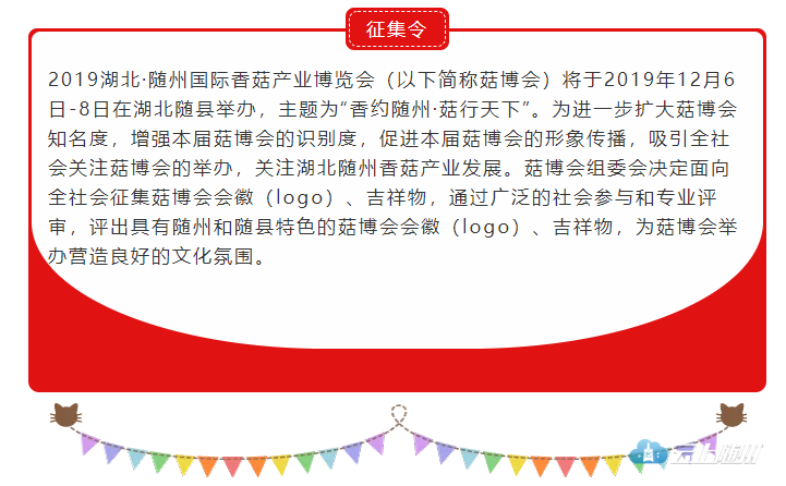 2、参赛作品于2019年10月15日下午5点30分前(截止时间)发送至菇博会组委会办公室指定邮箱196280251@QQ.COM(联系电话0722—3560319),文件标题请注明 “【随州菇博会会徽(LOGO)】”或“【随州菇博会吉祥物】”,邮件内容包括参赛选手的姓名(或企业名称)、联系方式、作品设计原件、设计说明文件。