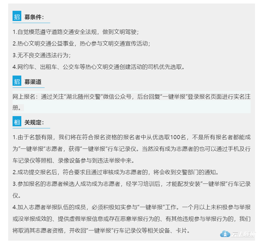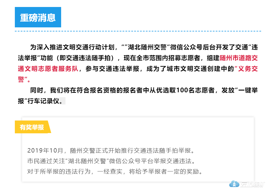 行车记录仪“一键举报”功能,是指在“湖北随州交警”微信举报平台的实名注册用户,成功绑定、安装“一键举报”行车记录仪,在行车过程中发现交通违法时,只需按下抓拍键,行车记录仪将自动截取按下瞬间违法车辆的前7秒和后7秒画面违法视频,并实时自动上传到“湖北随州交警”微信举报平台,举报成功作为违法证据采录的,将给予相应的奖励。