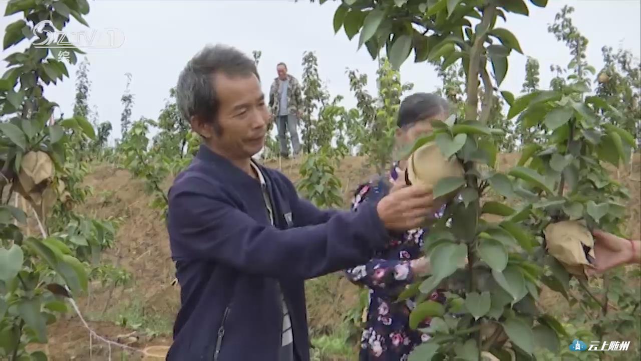 60岁的韩天会是种植金果梨的发起者之一,也因受到村民们的信任,负责看管这片梨园。梨子已经成熟了,为了防止沉甸甸的果实压断树枝,村民们用木棍把树枝撑了起来。这天,韩天会带领着村民们来到梨园里观摩和采收梨子,他随手拿起了一个梨子对记者说起了金果梨的好处。