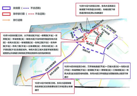 武汉市公安交管部门介绍,10月14日8时至22时,武汉体育中心(含主媒体中心、游泳馆、社会停车场)周边核心管制区,包括芳草路南段、车城东路、东风大道(太子湖北路至神龙大道)等路段,禁止车辆通行和停放,原有道路停车泊位临时取消。14日15时至22时,东风大道高架三角湖路下桥匝道(北向南)、车城北路下桥匝道(南向北)、东风大道高架南向北桥面(武汉西收费站至三环线)禁止车辆通行。