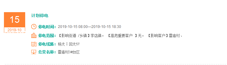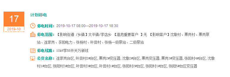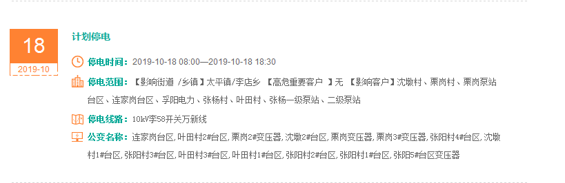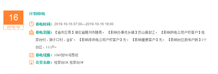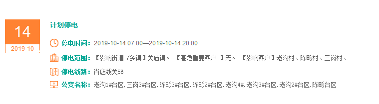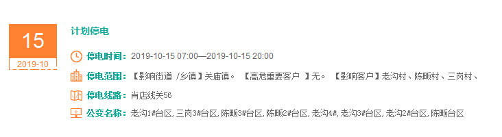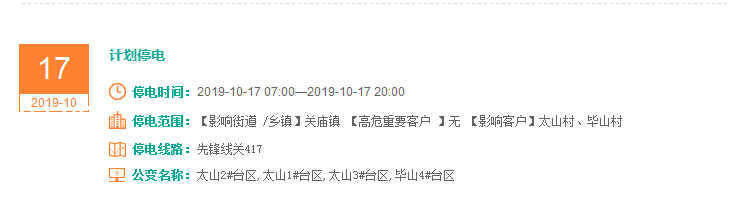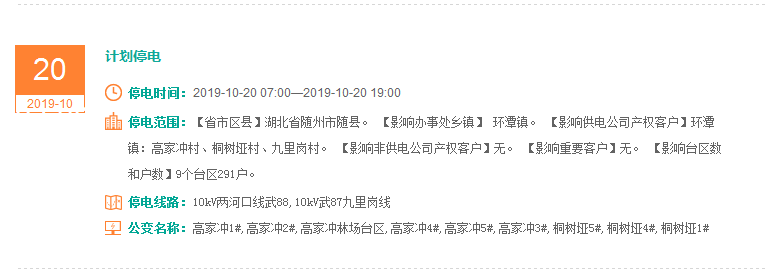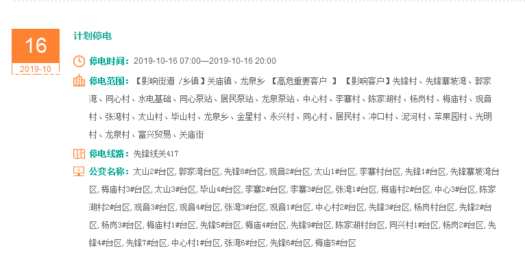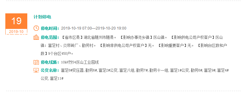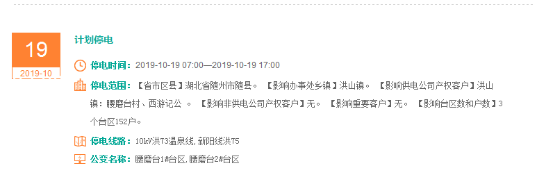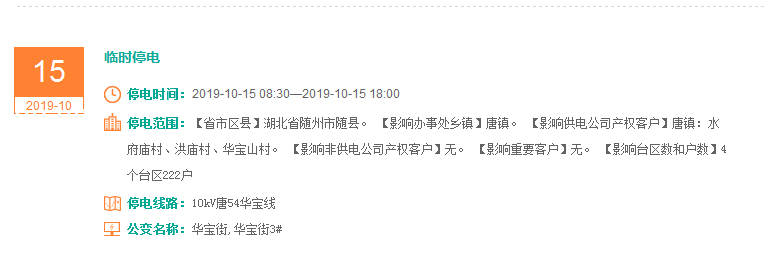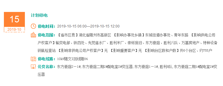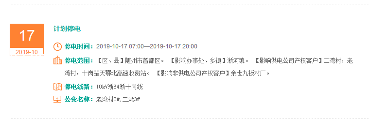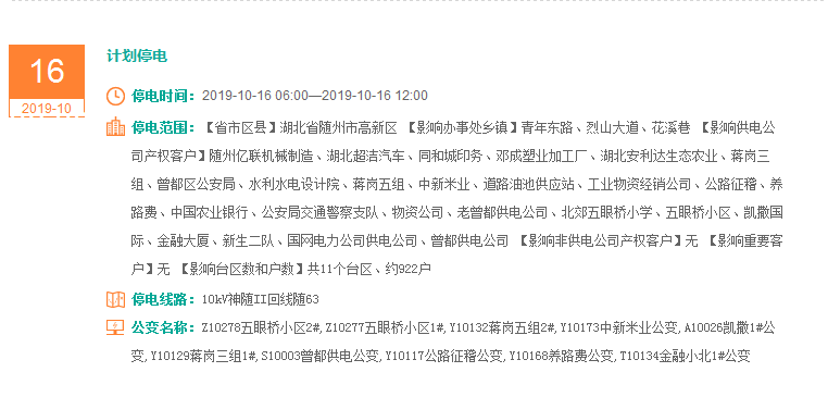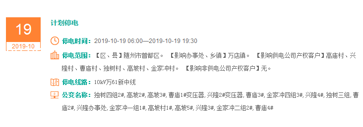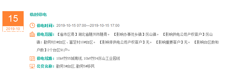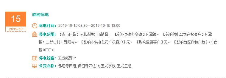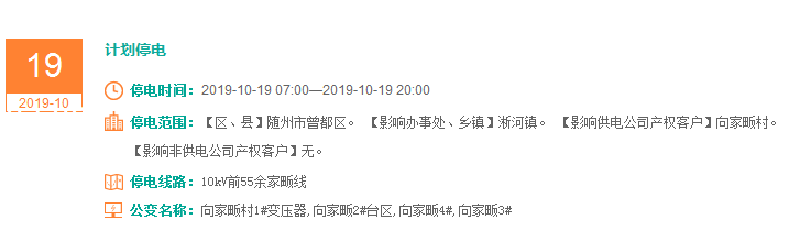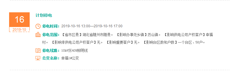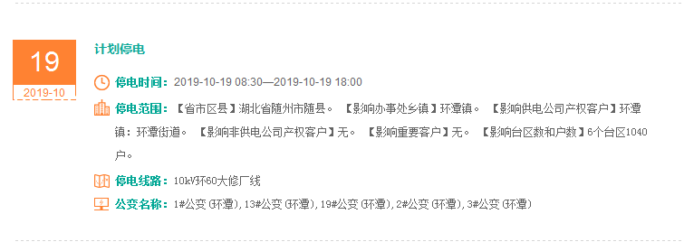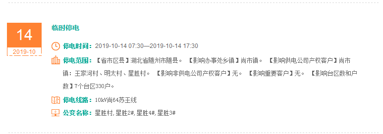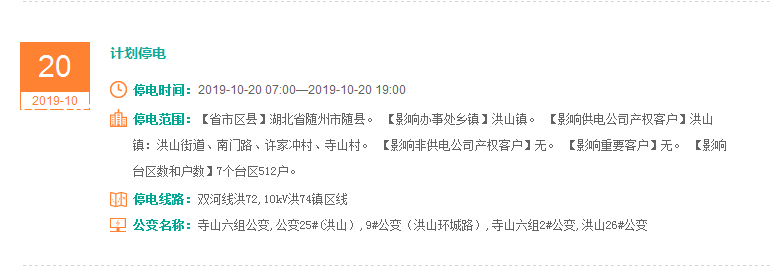 注意了! 未来一周随州又有地方开始停电了 记得提前做好准备! 赶紧看看这回停电有没有你家! ↓↓↓ 10月14日 10月15日 10月16日 10月17日 10月18日 10月19日 10月20日 编 辑:严晨菲 编 审:魏云峰 陈凡
