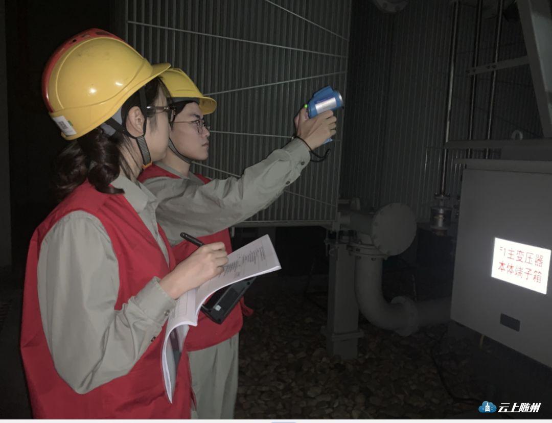 10月15日,随州检修分公司军运会保电员工刘海娟、周泽壹在220千伏民生变电站进行全站专业巡视红外测温工作,检查保电设备有无异常发热。(周泽壹)