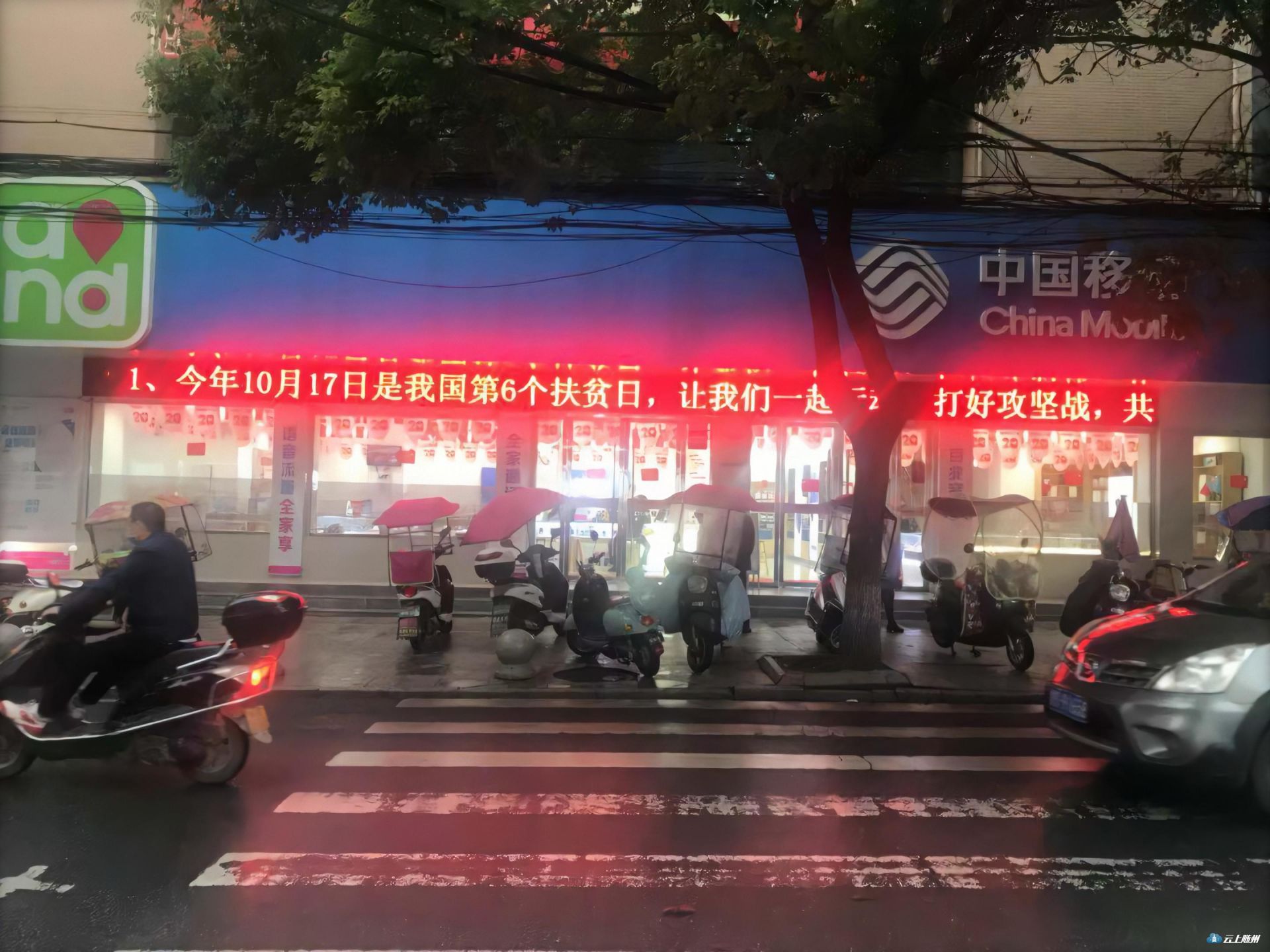 宣传展示鼓士气。公司充分利用单位和营业网点LED电子屏滚动播放扶贫日宣传标语,为脱贫攻坚工作提供了良好的舆论氛围和精神动力。
