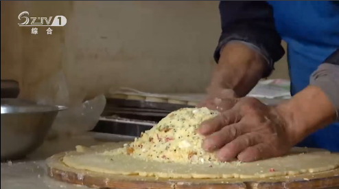一大早,在位于随县殷店镇老街上的江家喜饼铺里,江家义和老伴儿就开始忙碌起来,一个和面、包饼,一个燃火烧锅。只见江师傅双手麻利地把面团揉捏好,再用擀面杖把面团擀成厚度均匀的面皮,然后就是加入已经混合好的馅料。江师傅说,这馅料是按照一定的比例来调配的,光配料有十多种。