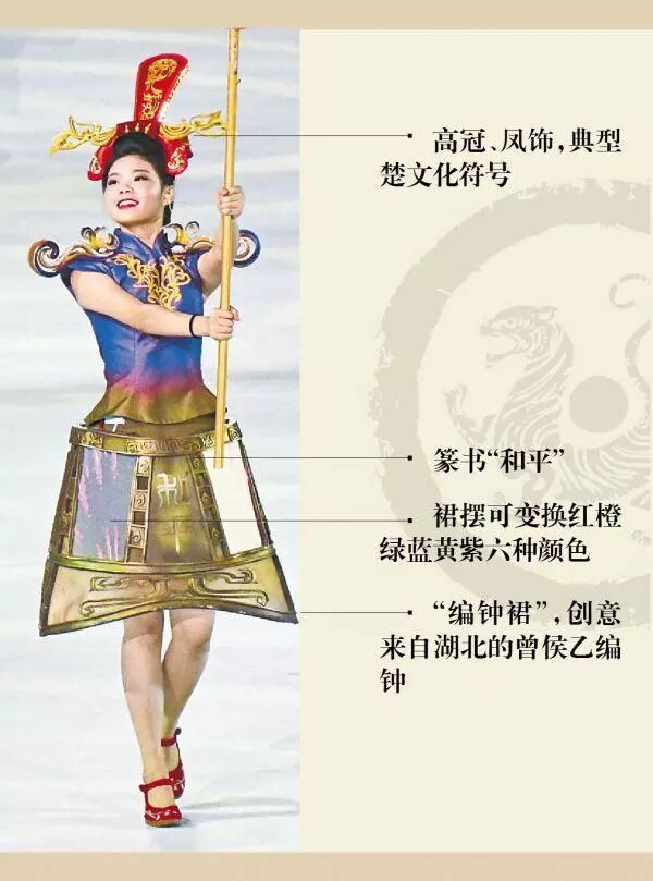 “这里运用的确实是编钟元素”,湖北省博物馆馆长方勤接受记者采访时肯定地说。从造型看,裙子借鉴的是编钟元素,正面还有篆书的“和平”两字。而引导员头上的高冠、凤饰,也是典型的楚文化元素,“在湖北出土的漆器、玉器上,经常可看到类似的凤形纹饰”。