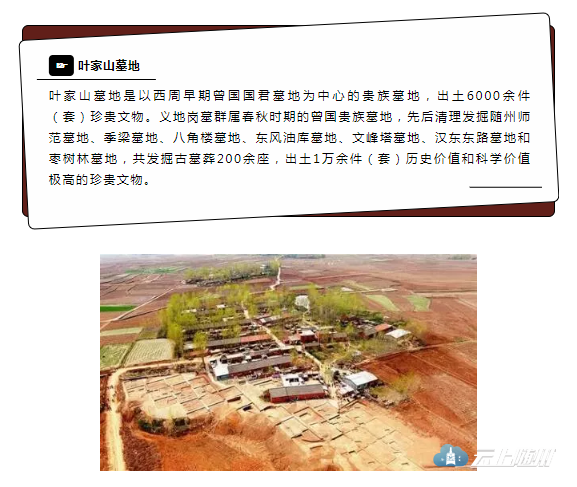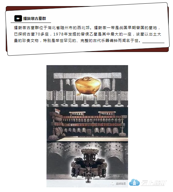 随州现已登录不可移动文物1966处,其中古文化遗址566处、古墓葬808处、古建筑446处、古石刻32处、近现代重要史迹114处。全市有国务院公布的全国重点文物保护单位5处、湖北省人民政府公布的省级文物保护单位36处、随州市人民政府公布的市级文物保护单位215处,国有文物博物馆3家,民办博物馆1家,馆藏文物5611件套。