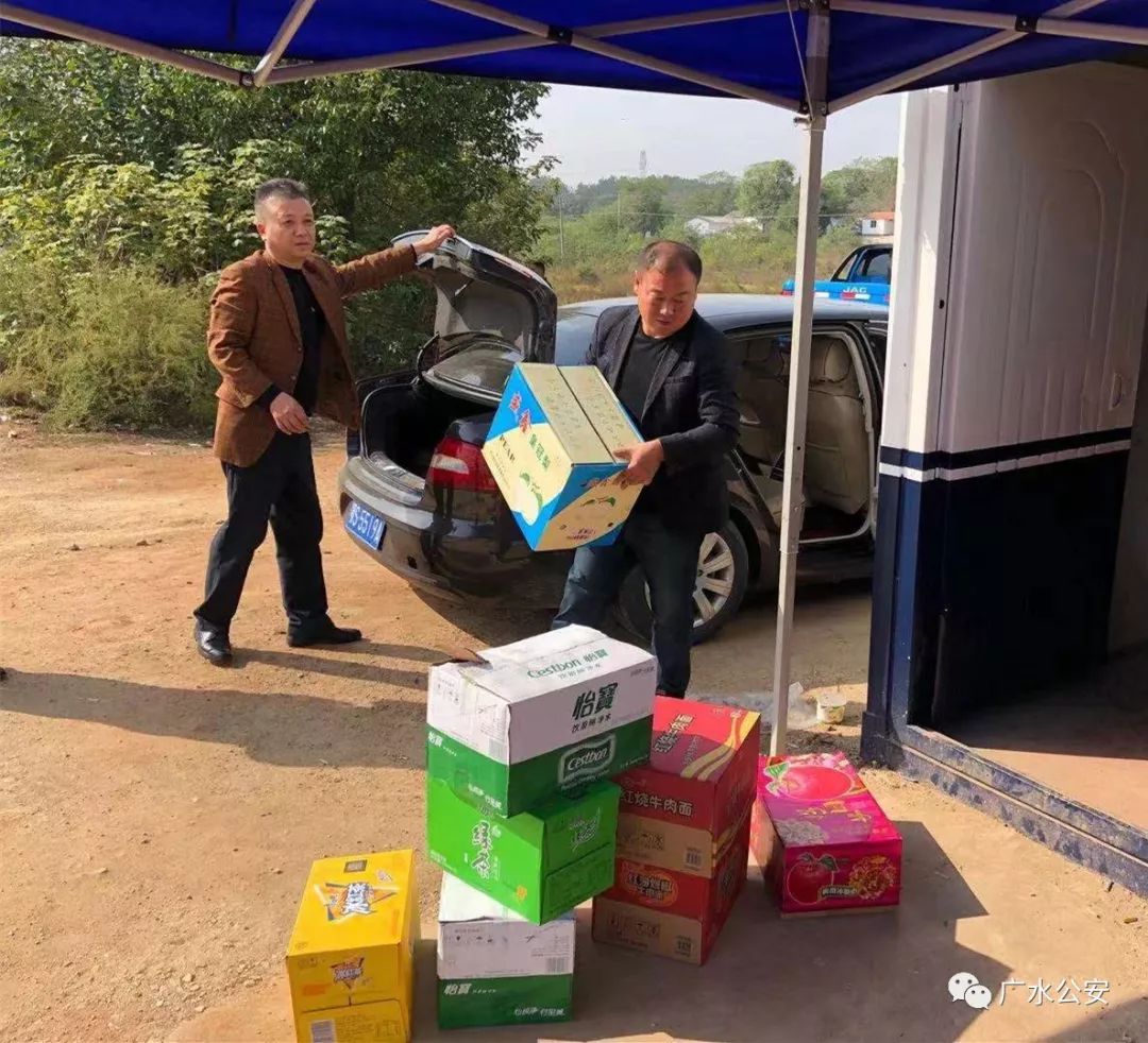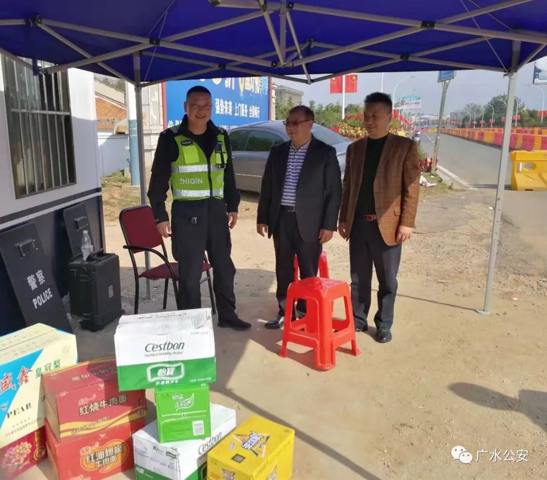 10月19日至10月20日,十里工业园区、广水街道办事处、蔡河镇镇政府主要领导,分别带着矿泉水、方便面、水果等食品,来到210省道蔡河检查站和麻竹高速应山、杨寨检查站点,慰问24小时坚守岗位的执勤民警。