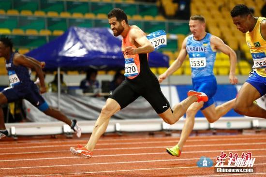 10月22日,第七届世界军人运动会田径比赛在武汉五环体育中心举行。在男子100米决赛中,伊朗选手HASSAN TAFTIAN 以10秒24夺冠。中新社记者 富田 摄